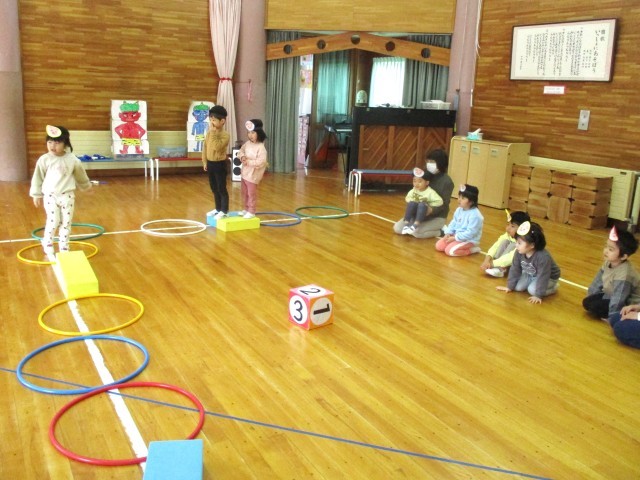 前回の経験から、今日もグループ対抗ですごろくをしました。「サイコロを振る」「出た目(数字)を言う」「(コマ役の友達は)その分進む」と役割を確認し、今回は積み木を「一回休み」の場所にしました。数の分進むこともまだ難しい友達もいますが、先生や友達に教えてもらいながら進んでいます。「一回休み」に止まらないようサイコロを振るとき「〇が出ませんように」と言ってから投げる友達もいました。また、グループ対抗の意味が分かり「もう少しでゴールだ」「やったー1位だ~!」と喜び合う姿も見られます。勝ったり負けたりしながらもみんなでする楽しさを味わっています。