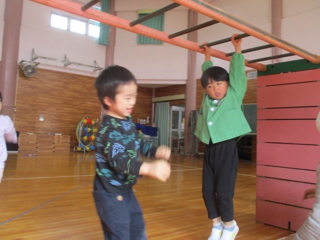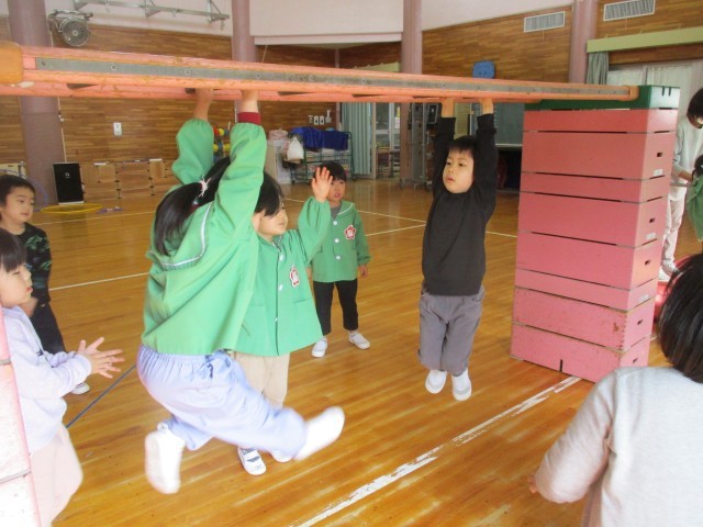 毎日、鉄棒や縄跳び等の運動遊びをしています。自分でぶら下がることが難しい友達もいるので、今日は巧技台を使って雲梯にして「10秒を目指そう!」と話して挑戦しました。ところがあっという間に落ちてしまい「あれ?」という表情をしている子もいます。「ギュッと握るよ」と知らせると、ちょっとずつ長くぶら下がれるようになってきました。りす組で遊んだ後、ぞう組さんに見せてもらったところ、スイスイ渡る姿に「すご~い!」と驚いていました。ぞう組さんの前でぶら下がっていると50秒、63秒と、記録が更新した友達は自分でもビックリしていました。後で話を聞くと「応援してもらったから!」とぞう組の友達に応援されたことも喜んでいました。応援が力になることも体験した子どもたちです。