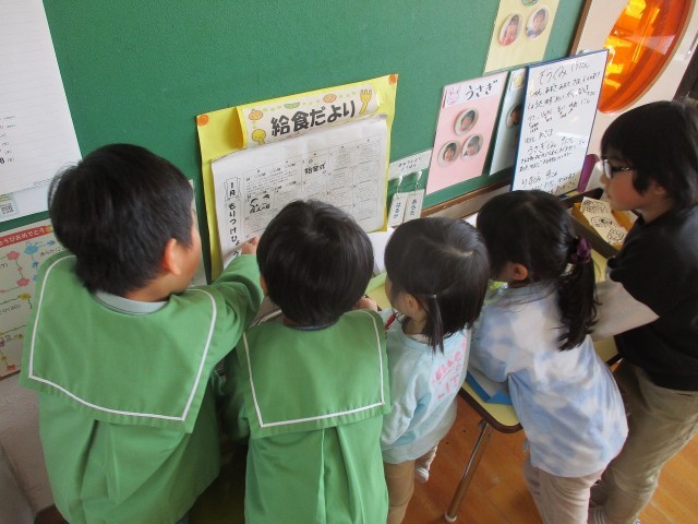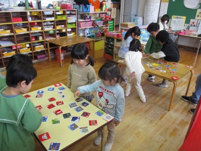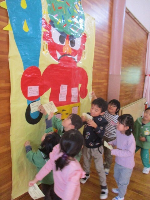 今週は給食週間がありました。「食べキリンしよう」「今日の献立は何だろう」と給食の時間を楽しみにしています。おかわりする子も増え、嬉しく思います。豆まきでは子どもたちが退治したい心の中の鬼を考え、遊戯室の鬼に貼っています。カルタ取りやこま回しも楽しんでいます。また、お子さんに話を聞いてみてくださいね。