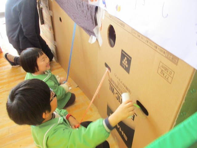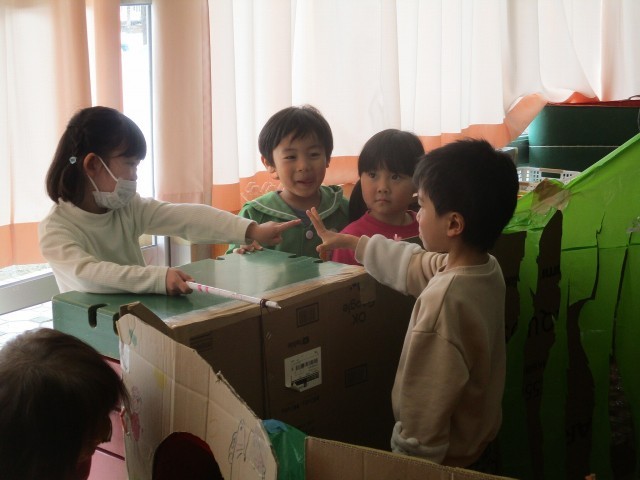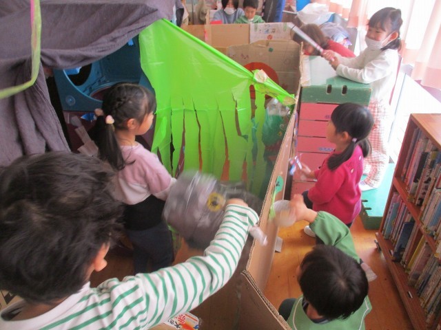 おばけやしきで遊ぼう!(4歳児) 公開日 2025/02/21 更新日 2025/02/21 今日のできごと 2月20日(木)今日は子どもたちがつくり、楽しんできた「おばけやしき」にぞう組さんやりす組さんを招待しました。たまごパックでつくったおばけや風船のおばけ等を動かしながら友達を驚かせました。おばけやしきの最後はジャンケンをし、勝ったら出られることを喜んでいました。
