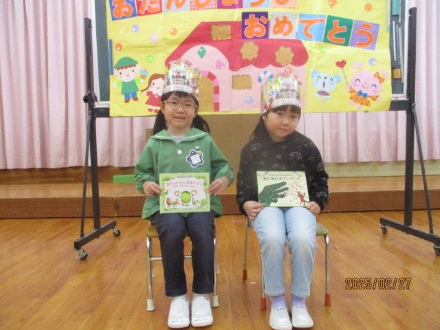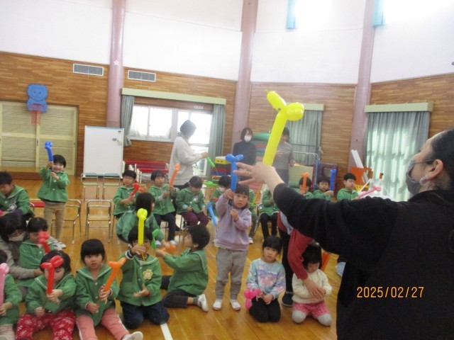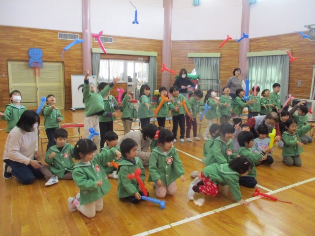 2月生まれの誕生会をしました。誕生児の友達に質問をしたり、歌を歌ったりしてお祝いをしました。お楽しみ会では「うーさんのバルーンショー」を楽しみました。子どもたちの知っているキャラクターをバルーンでつくってあり「わぁ、すごいね」と歓声があがっていました。バルーンを使って『はなさかじいさん』のお話を聞かせてもらったり、ネズミのバルーンで一緒に上に飛ばしたりと楽しい時間になりました。お土産にそのネズミと花の腕輪をもらいました。