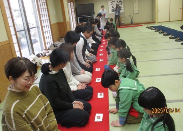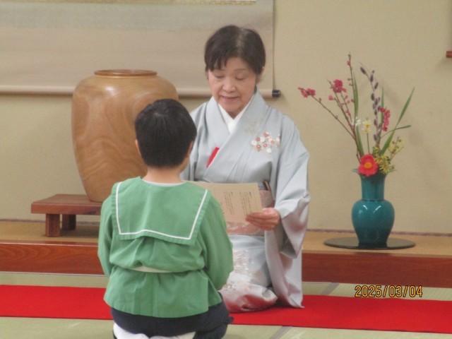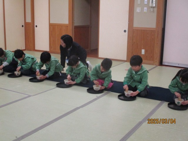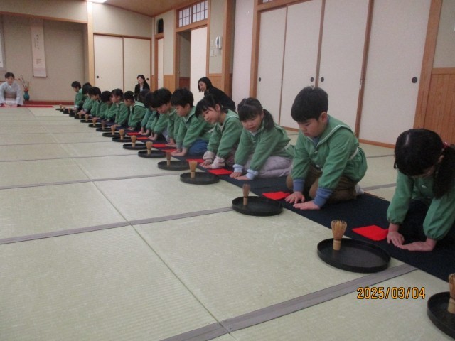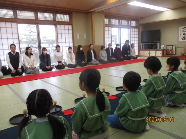 親子茶会(5歳児) 公開日 2025/03/04 更新日 2025/03/04 今日のできごと 3月4日(火) 親子茶会を速星公民館で行いました。1年間のお茶のお稽古をお家の方に見てもらう日で「おいしいお茶を点てたい」「泡いっぱいのお茶にしよう」と張り切っていた子どもたちでした。お菓子を運んで食べてもらったり、点てたお茶を慎重に運んだりとお家の方に喜んでもらえて、素敵なお茶会になりました。お茶会の後、一年間の頑張りの証書『おしるし』を講師の先生からいただきました。 +2