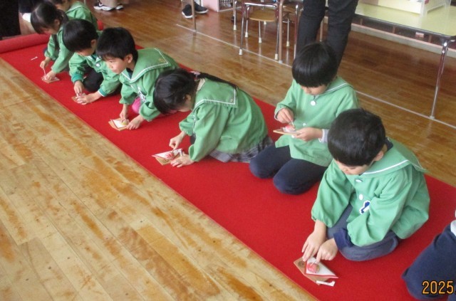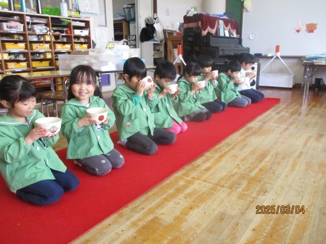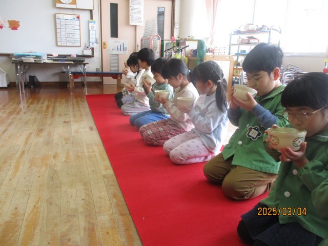 春のお茶会(5歳児) 公開日 2025/03/04 更新日 2025/03/04 今日のできごと 3月4日(火) 午前中は親子茶会でお家の方にお点前をふるまいました。午後からは自分たちのお茶会でお菓子やお抹茶を味わいました。お家の方の食べたお菓子を見て「おいしそう」と言っていた子どもたちは「食べるのもったいない」「甘くておいしい、抹茶と合いそう」とうれしそうな声が聞かれました。幼稚園最後のお茶会を楽しみました。