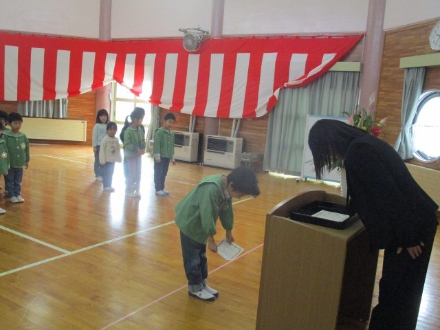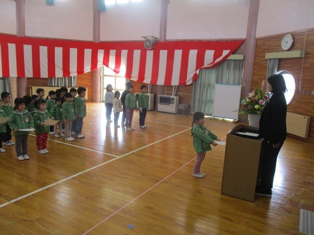 今日は3・4歳児の修了式がありました。先日の年長児の修了式の様子を見ていたことで、修了証書をもらうときは、元気に返事をし、園長先生から証書をもらいました。子どもたちの表情からも嬉しさが伝わってきました。