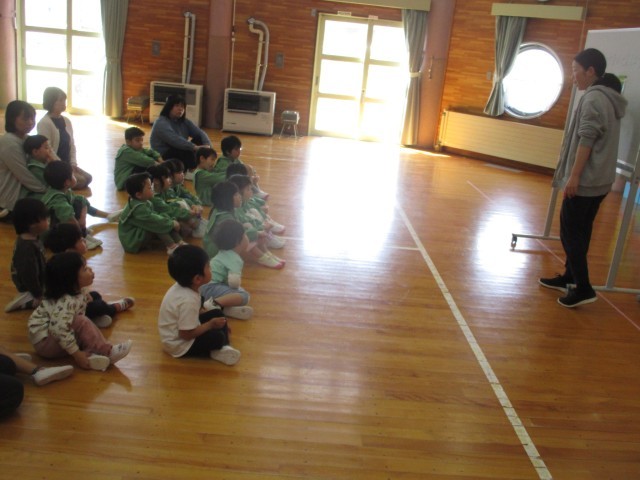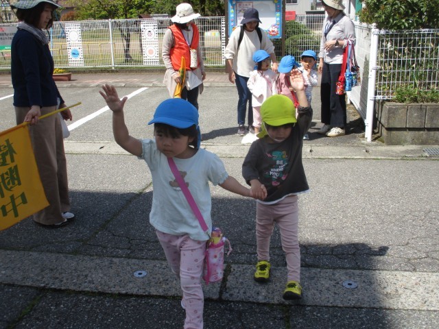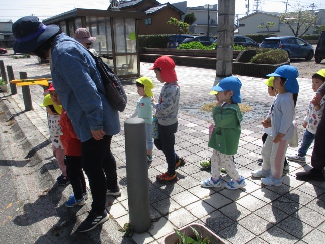 交通安全指導で道路の安全な歩き方についての話を聞き、道路を歩く時や横断する際の約束をイラストを見ながら確認しました。実際に散歩に出かけ、右側通行をすることや一旦停止をして右左を確認してから横断することなど、安全に気を付けて歩行しました。年長、年中児は年少児と手をつなぎ、優しくリードしていましたよ。今後も散歩をする中で、交通ルールや安全な歩行の仕方を知らせていきたいと思います。