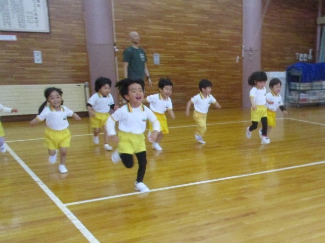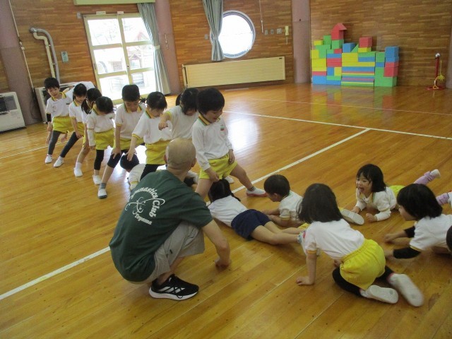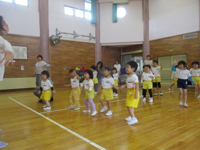 今日は今年度最初の体操教室がありました。全園児が集まり、体操をしたり走ったりしました。3歳児にとっては初めての体操教室でしたが、講師の先生や4・5歳児の姿を見てやってみようとする姿が見られました。年間を通して、いろいろな運動遊びを教えていただきます。楽しみですね。