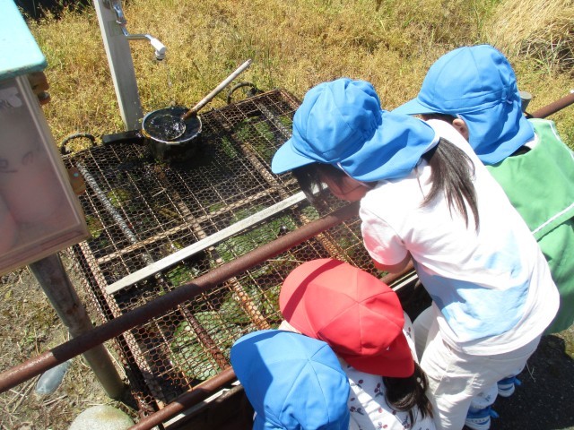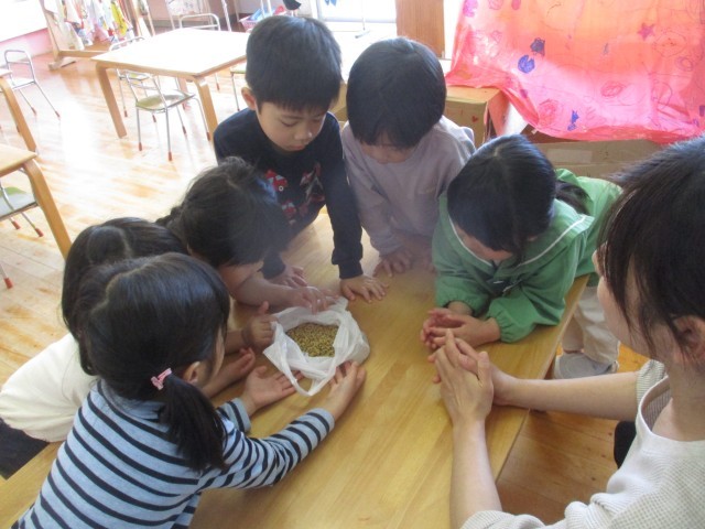 今日は自治振興会の方のお宅に訪問し、稲の苗を見せていただきました。「この苗からみんなが食べるお米ができるんだよ」と伝えると興味津々で見ていた子どもたちでした。また、畑で栽培している野菜や飼育しているヒブナを見学させてもらい、「5匹見つけたよ」「今、餌食べた!」などと友達と一緒に目を輝かせながら会話を楽しんでいました。帰りにはお米の種をいただき、発芽している様子を見たり、匂いをかいだりしながら観察し、「なんか匂いする!」と驚いている様子が見られました。これから種が育っていく様子を見ていけたらいいなと思います。