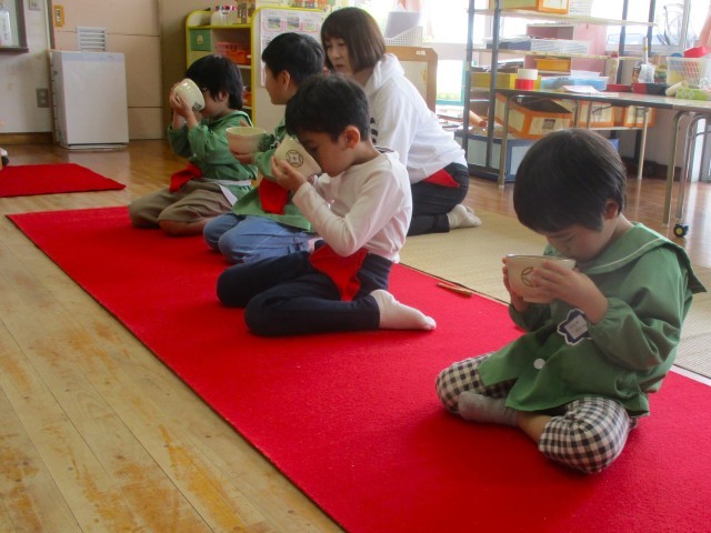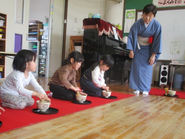 お茶教室(5歳児) 公開日 2025/05/14 更新日 2025/05/14 今日のできごと 5月12日(月) 今日は、2回目のお茶教室。前回、欠席していた子も楽しみに参加しました。茶筅で抹茶をシャカシャカすることを「お茶を点てる」という言葉で言うことも教わりました。少し苦いと言っている子もいましたが、美味しいお菓子の後に飲むとより美味しさが感じられたのかもしれません。