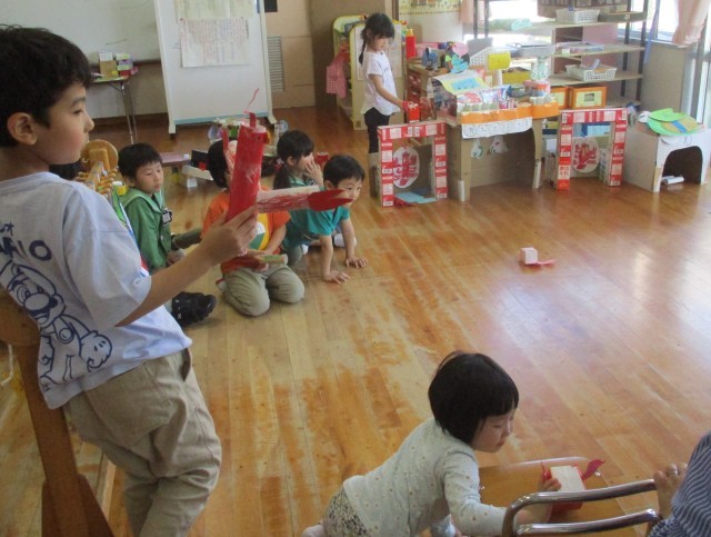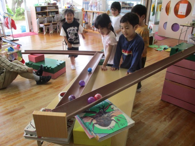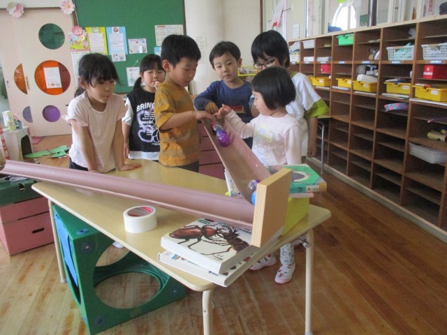 ボール転がし遊びでは、カプセルの中に入れるものによってスピードが変わることが分かってきました。また、2段目に落ちた時に、順番が入れ替わる不思議さで「ぼく2番がいい」「私は3番」など、ボールを置く順番もこだわって並べています。順番が入れ替わると嬉しそうに見守る子どもたちです。カエル飛ばしの遊びでは、カエルやザリガニたちがそれれぞれの家(カエルハウス、ザリガニハウス)に帰れるよう輪ゴムの力で「ビョ~ン」と飛んでいく様子を楽しんでいます。「もっと遠くまで」「もっと速く」と願いを込めながら持つところや引っ張り方を考えて楽しんでいいます。