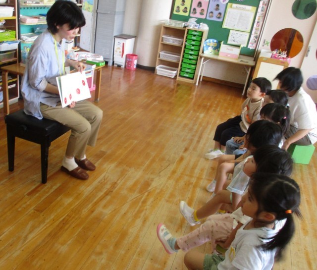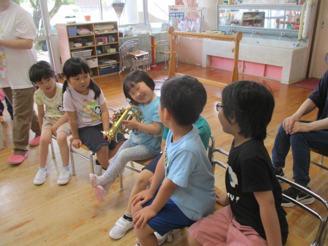 今日はPTAの方に絵本の読み聞かせ(4歳児)、トランペット演奏(5歳児)をしていただきました。年中児は「なりきりトマト」の絵本を読んでもらいました。普段育てていることもあり、興味をもって楽しんでいた子どもたちです。年長児は「となりのトトロ」のトランペット演奏を聴きました。近くで楽器も見せてもらい、とても良い経験になりました。ありがとうございました。