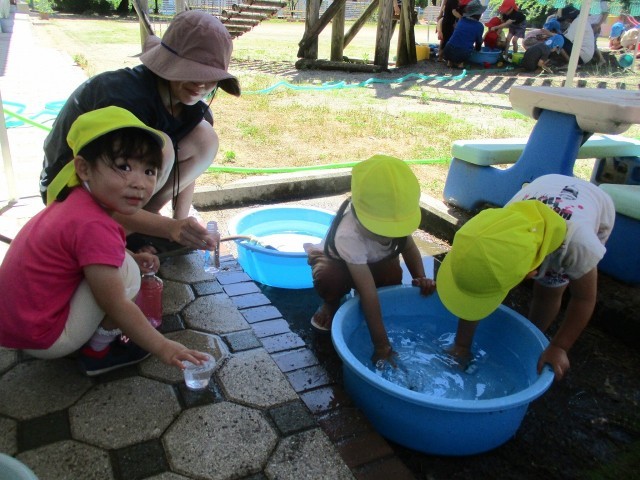 今日は戸外に出て、色水遊び・水遊びをしました。「いちごジュースだね」「オレンジになった」と偶然できた色を喜んだり水の気持ちよさを感じたりしていました。