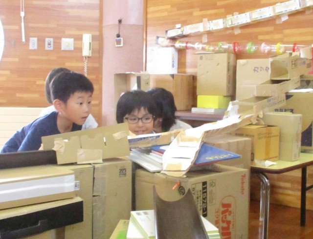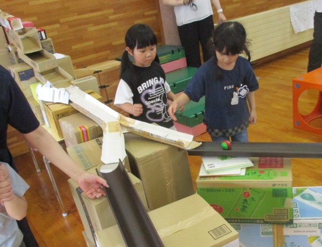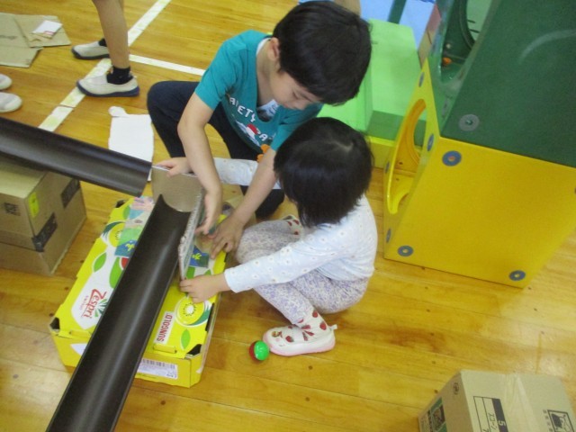 全園児で「はやほしジャングル」の遊び場で楽しんでいます。年長組は、ころころシャングルの遊びが年中、年少組の友達に喜んでもらった満足感から、遊戯室でもコースづくりに励んでいます。これまで作ったことのないコースが出来上がると「やったー!」と喜んでいます。3枚目の写真は、斜めになっているとどちらかのコースにしかいかないことから、傾きを見て調整しているところです。絵本を数冊挟みながら高さを合わせて今日のコースも完成し楽しむことができました。