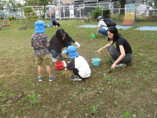 今日は朝からPTAの方が園庭の除草をしてくださいました。日に日に大きく育ってきた草を子どもたちも手伝って一緒に抜きました。かけっこのコースやブランコの周りなど子どもたちが遊びやすいようにきれいにしてくださってありがとうございました。