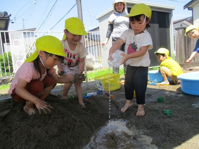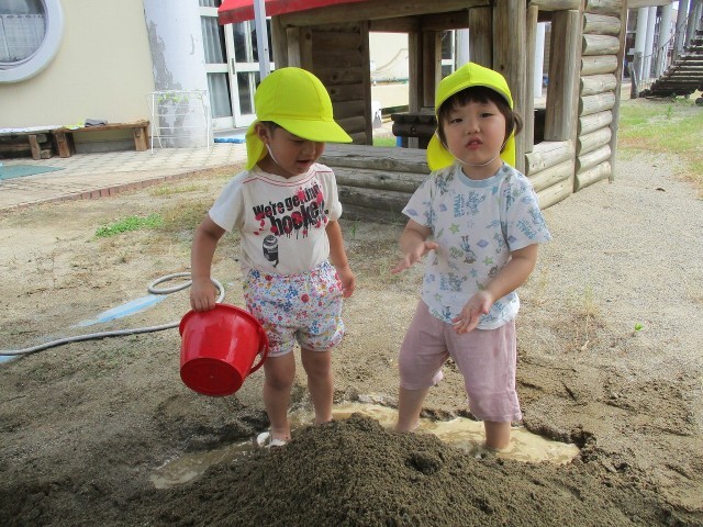 昨日今日と、泥んこ遊びを楽しんでいます。少しずつ水で遊ぶことに慣れ、砂場でも水を使って遊んでいます。「水いっぱいになった」と掘った穴に水を入れたり泥水の中に入ったりして楽しんでいます。