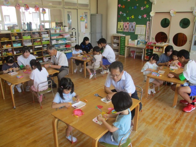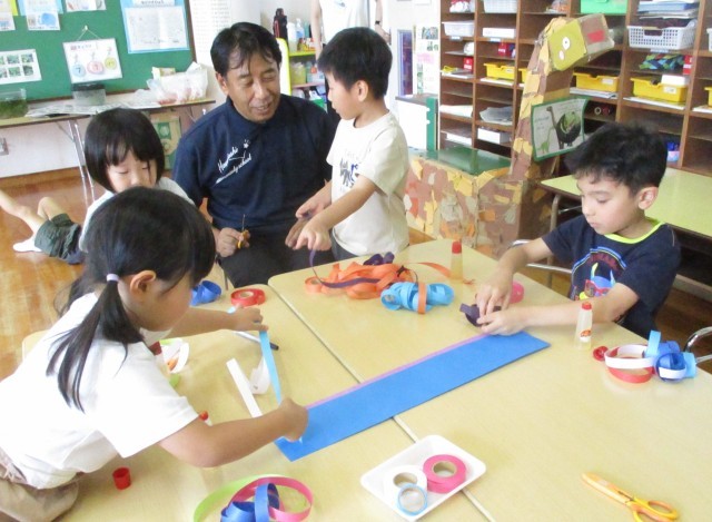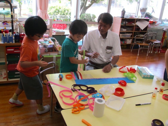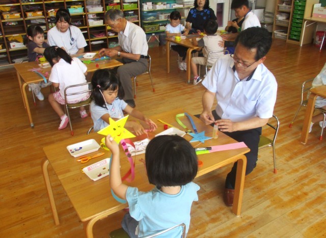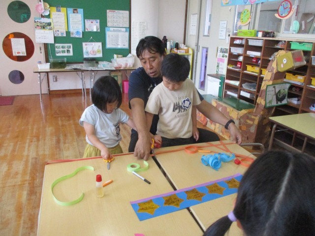 今日は「七夕こども会」がありました。4・5歳児は、前半、校区のお世話になっている方々と一緒に七夕飾りを作りました。5歳児は、グループで協力して「吹き流し」づくりです。同じ長さの紙テープを切ったり、のりで貼ったりしましたが、途中から作業を分担するようになり完成させたのはさすがでした。4歳児は「流れ星」づくりです。星に顔を描いたり、紙テープをのり貼りして仕上げました。一緒につくっているうちに話をしたり、どんな風に作っているかを見たりしてお客様とも打ち解けていく様子が見られました。