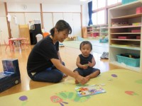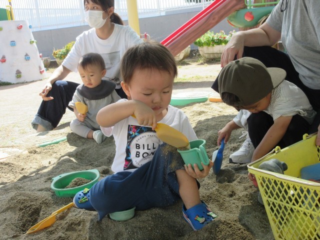 10月の親子サークルは、園庭で遊びました。砂場でママにごちそうを作ったり、遊具で...