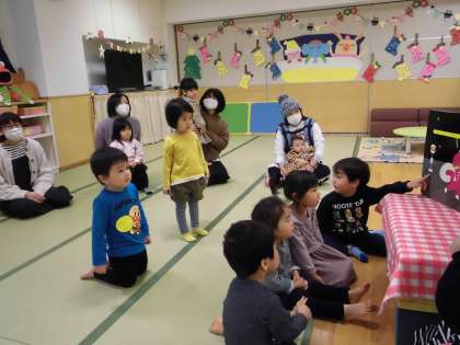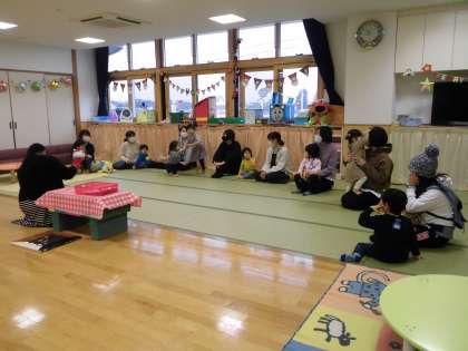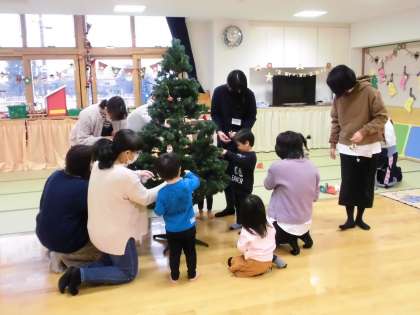 今日は雨降りで寒い日でしたが、8組のお友達が集まってくれました。お名前を呼んだあと、「りんごのほっぺ」などの手遊びをしたり「まどから おくりもの」の大型絵本を読んでもらったりしました。絵本の前に集まって、どの子も真剣にお話を聞いていました。絵本の次は「クリスマスみーつけた」ゲームです。ママと一緒に部屋の中に隠してあるテトラパックを探し、中に入っていたクリスマス飾りをみんなでツリーに飾り付けました。