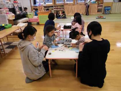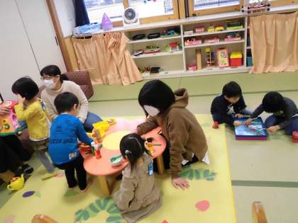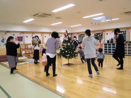 ツリーの飾り付けが終わると、みんなが大好きな「まってますクリスマス」の曲に合わせて踊りました。ママたちもダンスが上手です!たっぷり動いた後は、少し時間があったので自分の好きな遊びをしたり壁面飾りを作ったりして過ごしました。春になると年少組になる子供たち、気の合う友達とかかわる姿も増えてきましたね。