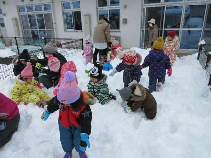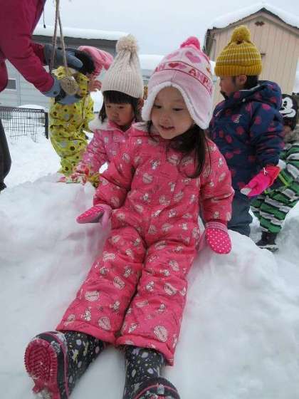 外は一面の銀世界!天気が良かったので、雪遊びをしました。フカフカの雪の上をニコニコ顔でズンズン進んでいった子供たち。雪玉を作ったり、雪でできた滑り台を滑ったりして楽しみました。