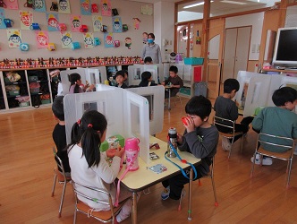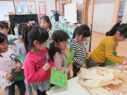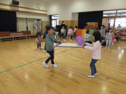 スタンプラリーをゴールすると、大きなプレゼントをもらって大喜びの年長さん。その後は中のお菓子をグループのみんなで食べました。最後に、遊戯室でボール運びゲームをしてみんなで盛り上がりました。