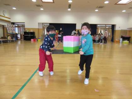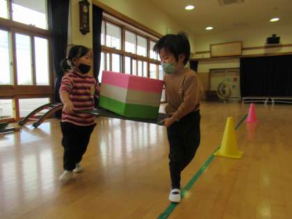 今日は、ひなまつり子供会をしました。ひなまつりの由来を聞いて、各学年に別れてゲームをして遊びました。3歳児は、ひしもち運びレースをしました。友達と協力をして落とさないように運びました。