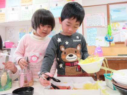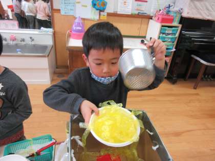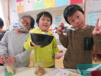 もも組では、らーめん屋さんをして遊んでいます。らーめんの他にも餃子や唐揚げ、チャーハンもあります。「いらっしゃいませ」と声をかけると、園庭で遊んでいたみかん組さんやうさぎ組、きりん組の友達がらーめんを食べにきてくれました。たくさんの注文に大忙しでしたが「おいしかったよ」と言われ、子供たちは大喜びでした。