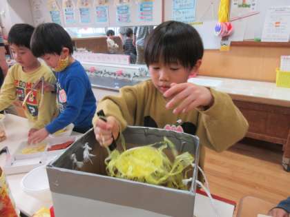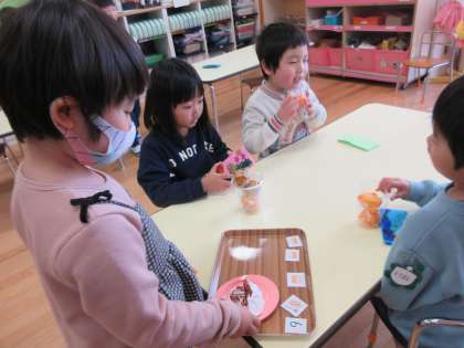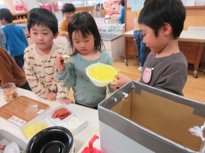 今週は、ほし組・にじ組・りんご組さんがらーめん屋さんに来てくれました。注文を確認しながら準備をしたり、らーめんを運んだりしてお店やさんを楽しみました。「今度はぎょうざお願いします」と追加注文もしてくれ、子供たちは張り切って品物をつくっていました。