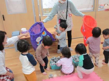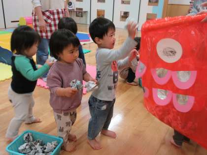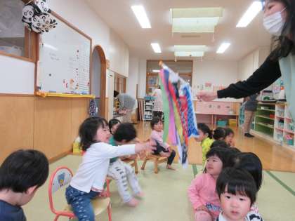 こいのぼり子供会をしました3 公開日 2021/04/30 更新日 2021/04/30 園行事 りんご組、みかん組のみんなもそれぞれのお部屋で集まりをし、こいのぼりのお話を聞きました。その後は新聞紙を丸めてこいのぼりの口に入れる玉入れを楽しみました。
