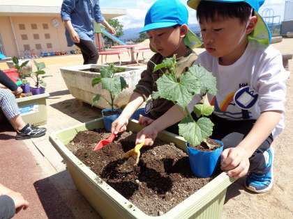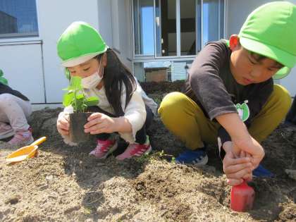 年長児が野菜の苗植えをしました。みんなで相談して決めた、ミニトマトや枝豆、キュウリ等の苗をよく観察してみると、花がついているものもあり「紫の花が咲いているね」「早く大きくなってほしいな」と生長を楽しみにしているようでした。苗を植えた後は、たっぷりと水をあげました。これから大切に育てていきたいと思います。