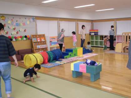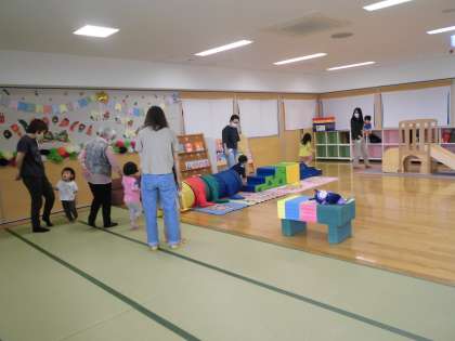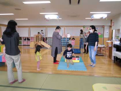 5月25日(火)メロンサークル・その2 公開日 2021/05/26 更新日 2021/05/26 子育て支援 集まりの会が終わった後、みんなでサーキット遊びをしました。トンネル、滑り台、鉄棒、巧技台など、いつも遊んでいる身近な遊具を組み合わせて、飛んだり滑ったり、ぶら下がったりする活動を何度も繰り返し行いました。付き添っている大人の方が「疲れた」とつぶやくほど、子供たちはニコニコ大喜びで遊んでいました。
