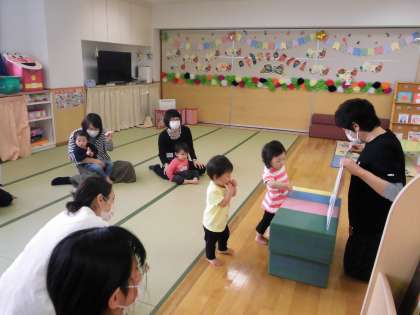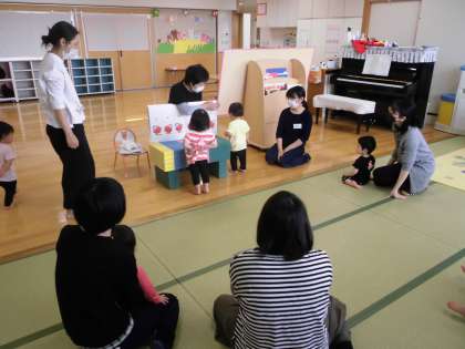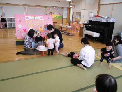 集まりの会で大型絵本「だるまさんが」や「だるまさんと」を見た後、5月生まれの誕生会をしました。前に出た誕生児にお祝いの歌を歌ったり、おめでとうカードをプレゼントしたりしました。初めての誕生会に子供たちは、誕生児の冠や前に置いたケーキ(おもちゃ)のイチゴをつまんだりして興味津々でした。自分の誕生日がくるのを楽しみに待っててね!