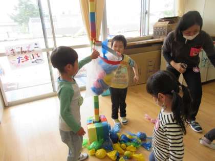 お菓子ランド、楽しかったね(5月28日) 公開日 2021/05/31 更新日 2021/05/31 年長ほし・にじ組 「お菓子のゲームをつくりたい」と声があがり始まったお菓子ランド。ドーナツ輪投げやキャンディー玉入れ等のゲームを考えてつくり、役割を交代しながら遊びました。 たくさん遊んだあとは他のクラスの友達をお客さんとして招待しました。小さい友達を案内をしたり、遊び方を教えたりして優しく関わる姿が見られました。