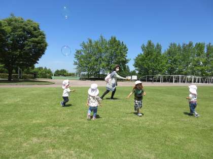 お散歩でシャボン玉を楽しみました 公開日 2021/06/01 更新日 2021/06/01 0歳児いちご・1歳児りんご組 南公園のさわやかな青空の下で、シャボン玉を楽しみました。 シャボン玉を追いかけて走ったり、手を伸ばして捕まえようとしたり、風に乗って飛んでいく様子を眺めたりしていた子供たちです。