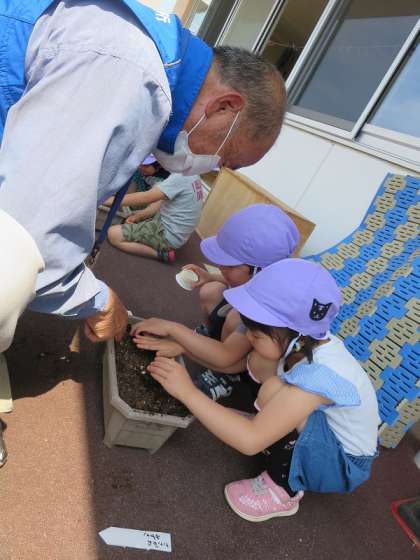 今日は園にグリーンキーパーさんが来られて、一緒に黄花コスモスと向日葵を植えました。植え方のお話を聞いてから、自分のプランターに種をまきました。最後にみんなで「大きくなあれ」の気持ちを込めて、お水をあげました。