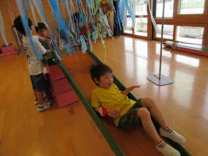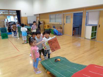遊戯室に子供たちの好きなキャラクターの遊び場をつくって遊んでいます。草タイプ、岩タイプ等のいろいろな遊び場が、それぞれ子供たちのイメージでつくってあり、岩に当たらないように登ったり、水にあたらないように滑ったりと、楽しいコーナーがいくつもあり、ほし組で繰り返し遊びました。「今度は他のクラスの友達も招待したい」という声が出て、一緒に遊ぶことにしました。年少組さんや、年中組さんを招待した時には、やり方が分からずに困っている友達に「こうやってやるんだよ」とやり方を見せてあげたり、階段を上るとき手をつないであげたりと、優しく接する姿がたくさん見られました。遊び終わった後に招待した友達から「岩タイプがおもしろかった」「全部楽しかった」などの感想を聞き、嬉しそうなほし組の子供たちでした。