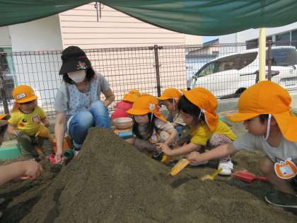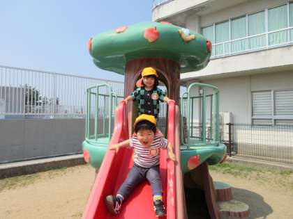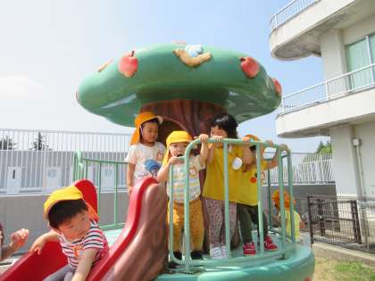 晴天の下、今日は園庭で遊びました。砂遊びやかけっこ、滑り台をして楽しみましたよ!