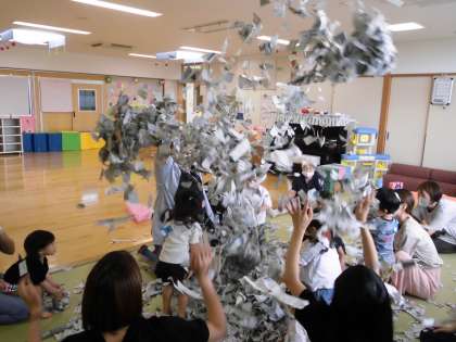 6月15日(火)メロンサークル・その2 公開日 2021/06/15 更新日 2021/06/15 子育て支援 はじめはママと一緒に優しく新聞をちぎっていたのですが、そのうち行動がだんだん大胆になっていき、たくさんちぎった新聞をかき集めては「わーい、わーい!」と友達にかけたり自分にかけたりして遊びだしました。本当に楽しかったね!