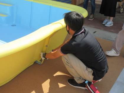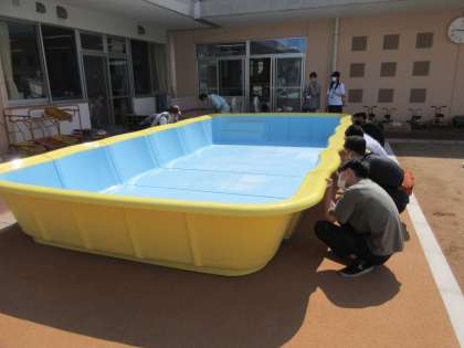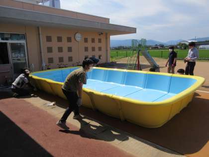 明日のプール開きのために今日は朝から親進会のみなさんがお手伝いに来てくださり、みんなで組み立ててくださいました。保育室から見ていた子供たちも興味津々。「僕のお父さんだ!」「だんだんできてきた〜」「早く入りたい!」とプールが出来上がっていく様子をわくわくした表情で見ていました。
