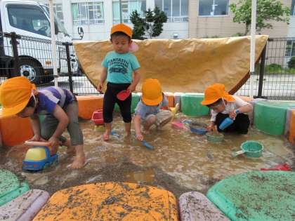砂場に水を入れて川のようにすると、大喜びの子供たち。夢中になって泥遊びを楽しんでいました。タライに入っている小さい人形をカップにいれ、嬉しそうに水遊びをする姿も見られました。