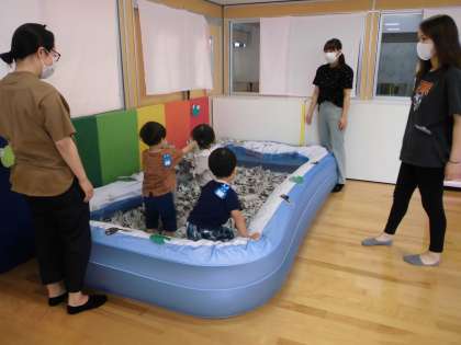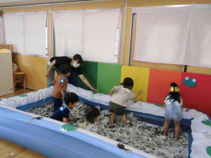 6月22日(火)メロンサークル:その2 公開日 2021/06/23 更新日 2021/06/23 子育て支援 誕生会の後、少し時間があったのでまた遊びの続きをしました。はじめはオモチャで遊んでいたのですが後半は新聞プールが気に入ったようで、動きがどんどん大胆になっていきました。