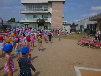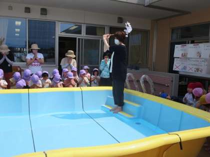 プール開きをしました。水遊びのときの約束を聞いたり、園長先生がプールのお清めをする様子を見て「ケガをしないように仲良く遊びます」と約束をしたりしました。その後、クラスごとにプールに入って楽しみました。この夏、たくさん水遊びを楽しんでいきたいと思います。