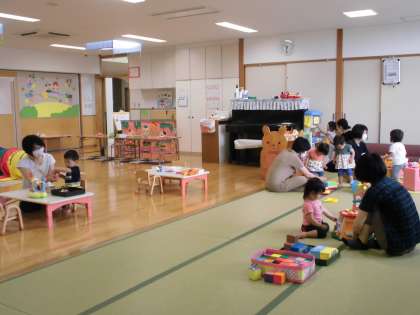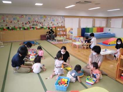 6月23日(水)いちごサークル・その1 公開日 2021/06/29 更新日 2021/06/29 子育て支援 今日は、8人のお友達が遊びに来てくれました。予定では6月生まれの誕生会だったのですが、6月生まれの誕生者がいなかったのでママと一緒にゆったりと遊びました。子供たちが遊びに夢中になっている間に、お母さん方に七夕の短冊に願い事も書いてもらいました。