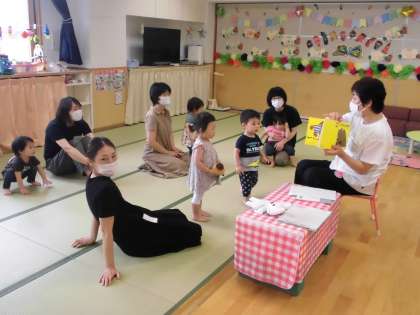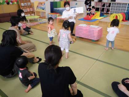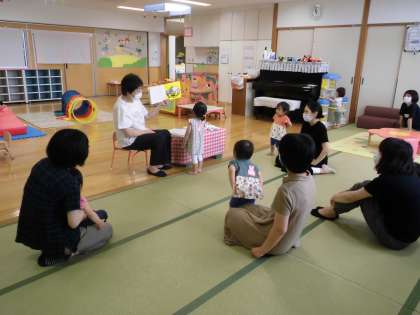6月23日(水)いちごサークル・その2 公開日 2021/06/29 更新日 2021/06/29 子育て支援 遊びの途中でお友達の名前を読んだり、手遊びや絵本を読んだりしました。ママと一緒に「とんとん…アンパンマン」の手遊びをしたりカエルの歌を歌ったりしました。絵本を読んだ後は、またオモチャで楽しく遊びはじめました。
