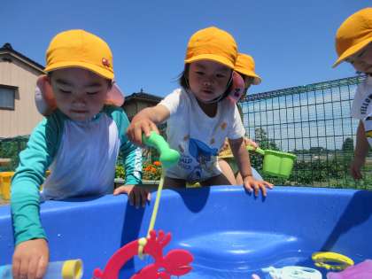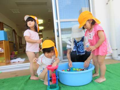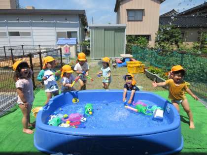 水遊びをしました!(6月28日) 公開日 2021/06/29 更新日 2021/06/29 2歳児みかん組 お天気の良い今日は水遊びをしました。水遊びの気持ちよさや楽しさを全身で感じたみかん組の子供たちです♪