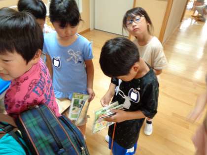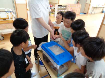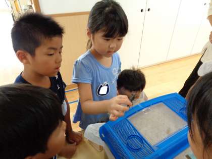 保護者の方から「こども園で子供たちに見せてあげてください」とたくさんのクワガタやカブトムシをいただきましたよ。子供たちは毎朝登園すると「お〜、今日も元気に動いてる」「エサ、もうないね。いっぱい食べたからまた交換しなきゃ!」と興味津々で観察ケースを覗き込みながら話しています。初めは恐々と見ていた子供たちも、どこを持てばいいのか本で調べ「先生!私、持ってみる!」と触れ合うことに挑戦するようになりました。身近な虫などに興味をもち、関わりを重ねることで、命を大切に扱おうとする心を育てていきたいと思います。