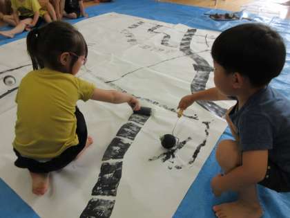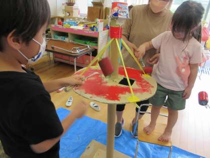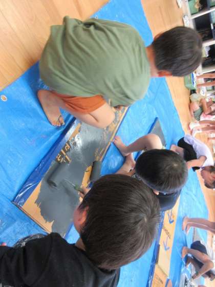 もも組タウンで遊んでいるよ1 公開日 2021/07/16 更新日 2021/07/16 年中もも・すみれ組 大型バスをつくってから車に興味津々の子どもたち。自分の車を走らせる町をつくろうと話し合いました。みんなでローラーで道を描いたり、タワーや高速道路に色を塗ったりしました。車は図鑑や絵本を見ながら、自分の好きな乗り物を空き箱やペットボトルのキャップを使ってつくりました。スポーツカーやクレーン車、救急車等、いろんな車が出来上がりました。