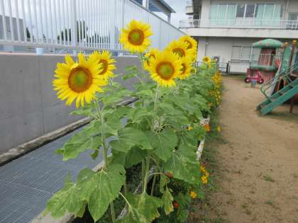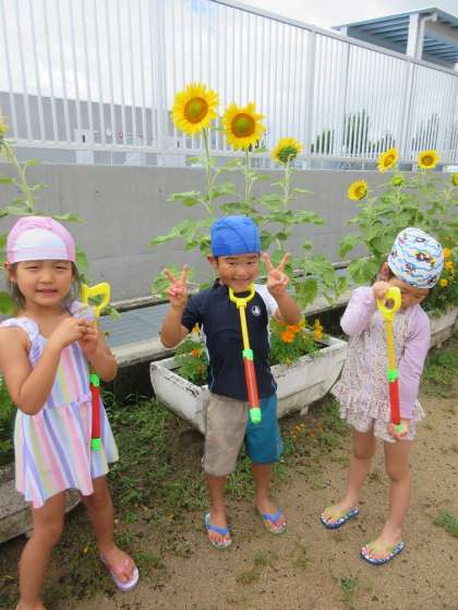 ひまわり咲いたよ! 公開日 2021/08/06 更新日 2021/08/06 年中もも・すみれ組 みんなで植えた向日葵と黄花コスモスが咲きました。みんなの身長よりも大きくなってびっくり!毎朝水やり頑張ってよかったね。