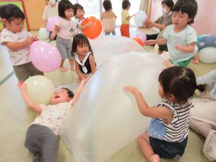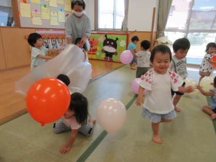 風船をたくさん出して遊びました。好きな色の風船を抱きしめたり、ポーンと投げたりしていました。大きな袋の風船に座ったり寄りかかったりするのも楽しそうでしたよ!