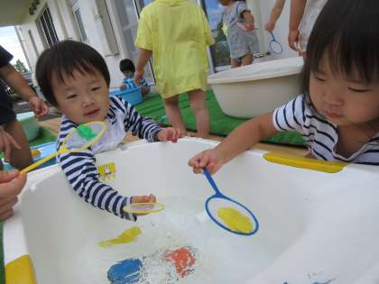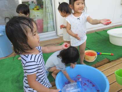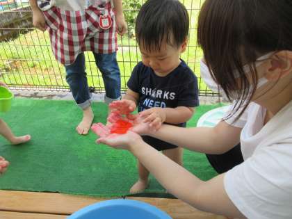 久々の水遊び、楽しいな!(りんご組) 公開日 2021/08/11 更新日 2021/08/11 0歳児いちご・1歳児りんご組 8月11日(水) 今日は久しぶりに水遊びをしました。水を自分の体にかけて全身で水遊びを楽しんでいました。金魚すくいをしたり、寒天遊びもしました。いろいろな遊び方で、水遊びを楽しんでほしいなと思っています。