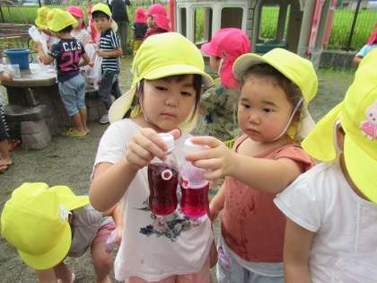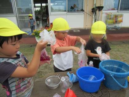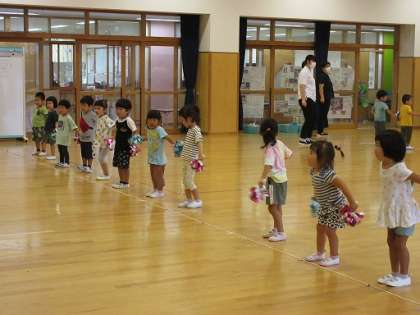 2学期が始まりました!(9月1日) 公開日 2021/09/01 更新日 2021/09/01 年少きりん・ぱんだ組 9月1日(水)うさぎ、きりん組 今日から2学期がスタートしました。始業式は、放送で園長先生の話を聞きました。子供たちからは、プール遊びや花火など夏の楽しかった経験をたくさん教えてもらいましたよ。子供たちの経験したことをもとに2学期の遊びにつなげていきたいと思っています。その後は、ポンポンをもってリズムを踊ったり、夏の間にたくさん咲いた朝顔で色水ジュースを作ったりしました。